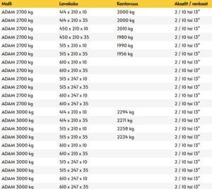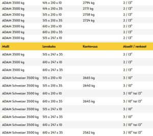 Adam-sarja koostuu hydraulisesti kippaavista vaunuista, joiden vakioleveys on 210 tai 247 ja pituudet 414 – 515 – 610 cm. (erikoismallina jopa 660 cm) Kokonaismassat ovat 2,6 – 3,0 – 3,5 tonnia, suurin kantavuus n. 2850 kg. Kaikki saatavana joko laita- tai reelinkivarustuksella. Runsas pressukapellivalikoima. Malliston ehdoton kuningas on 3-akselinen Schweizer, jonka pitkittäisvakaus ja kääntöherkkyys tekevät siitä ainutlaatuisen työkalun tosi ammattilaiselle.