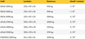 Atlas-sarja koostuu kolmesta eri painoluokan 3-kaatokippivaunusta. Vaunut voidaan varustaa verkkolisälaidoin, jolloin lavan vetoisuus on lähes 8 kuutiota. Myös ajorampit ovat mahdolliset. Ihanteellinen vaunusarja polttopuukauppiaille, maansiirto- ja puutarhaurakoitsijoille, kiinteistöhuoltoon, maatalouteen. Koneellinen kuormaus ja koneellinen purku ovat tehokkuutta ja nykyaikaa. Saatavana käsipumpulla, sähköhydrauliikalla tai molempien yhdistelmällä. Tätä parempaa ei ole. Atlakselle löytyy myös ”pikkuveli” Delta 250 x 150 x 35 lavalla, sekä ”isoveli” Porthos 414 x 210 x 35 lavalla.